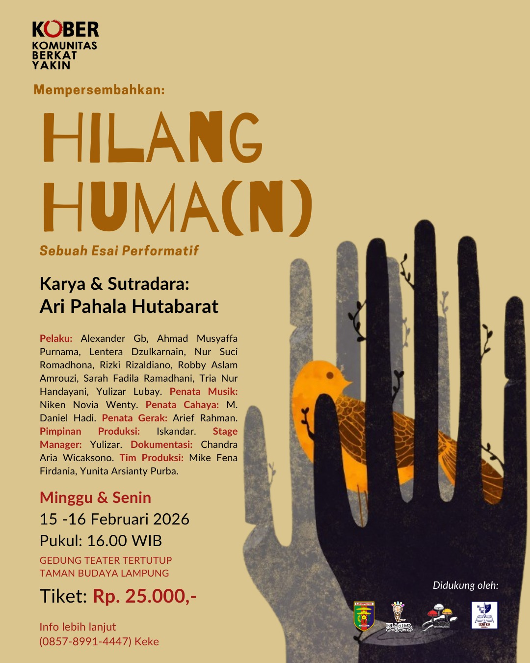 Baradatu 13 Februari 2026. Rumah Baca Yussuf (RBY) mengajak para pecinta literasi, seni, dan isu lingkungan untuk menyambut kembali pertunjukan reflektif dari Kober (Komunitas Berkat Yakin). Kelompok teater ini akan mementaskan “Hilang Huma(n): Sebuah Esai Performatif” di Gedung Teater Tertutup (GTT) Taman Budaya Provinsi Lampung, pada Minggu–Senin, 15 & 16 Februari 2026, pukul 16.00 WIB. Sebelumnya, karya ini telah dipresentasikan dalam rangkaian Festival Teater Sumatera III di GTT Taman Budaya Sriwijaya pada 24–25 September 2025. Kini, “Hilang Huma(n)” kembali hadir untuk menyapa publik Lampung dengan daya gugah yang lebih matang dan mendalam.